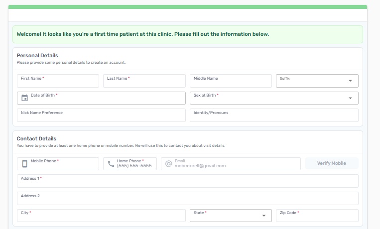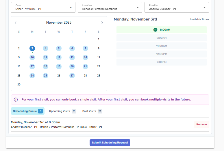 - If this is your first time at Rehab 2 Perform, you will be prompted with some basic information as you create your profile, prior to scheduling