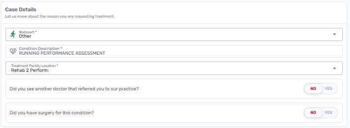 - Case Details, please select OTHER, for Body Part, and in Condition Description enter RUNNING PERFORMANCE ASSESSMENT